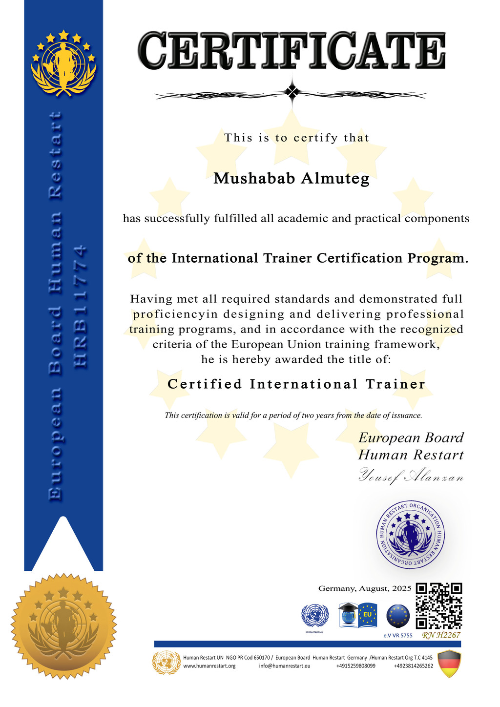 European Board Human Restart GmbH is officially registered in Germany and delivering training programs recognized across the EU for their quality and transferability.
